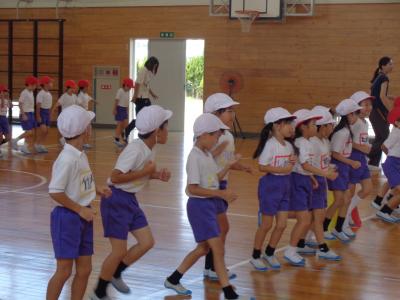 場所移動の流れを身につけるために、何度もくりかえし移動練習に取り組んでいた低学年と中学年。とてもスムーズに移動できるようになりました。先生が全体指導している間は、しっかりとお話を聞く姿もたくさん見られました。来週からは、実際に運動場に出て実際の広さを確かめながら練習を重ねていく予定です。