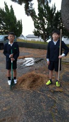 2人は黙々と松の葉を、集めてくれました。あっという間に、駐車場がきれいになっていきます。