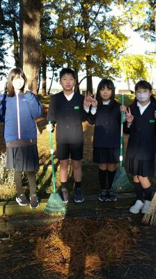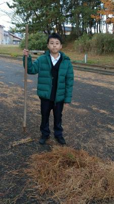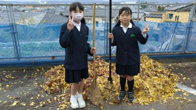 3日(火)の朝も、一面のオレンジ色の枯葉の絨毯の中、一生懸命落ち葉を集めていると、4年生の2人が、校舎から飛び出してきました。