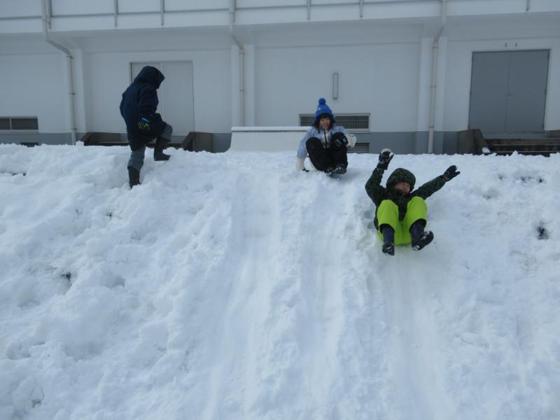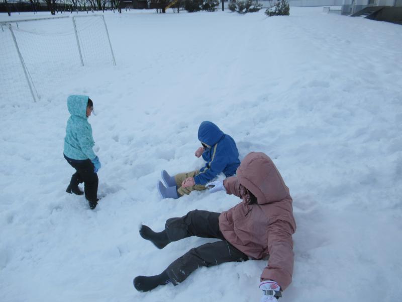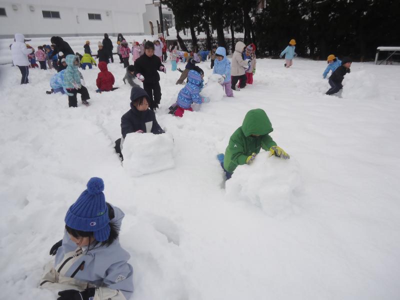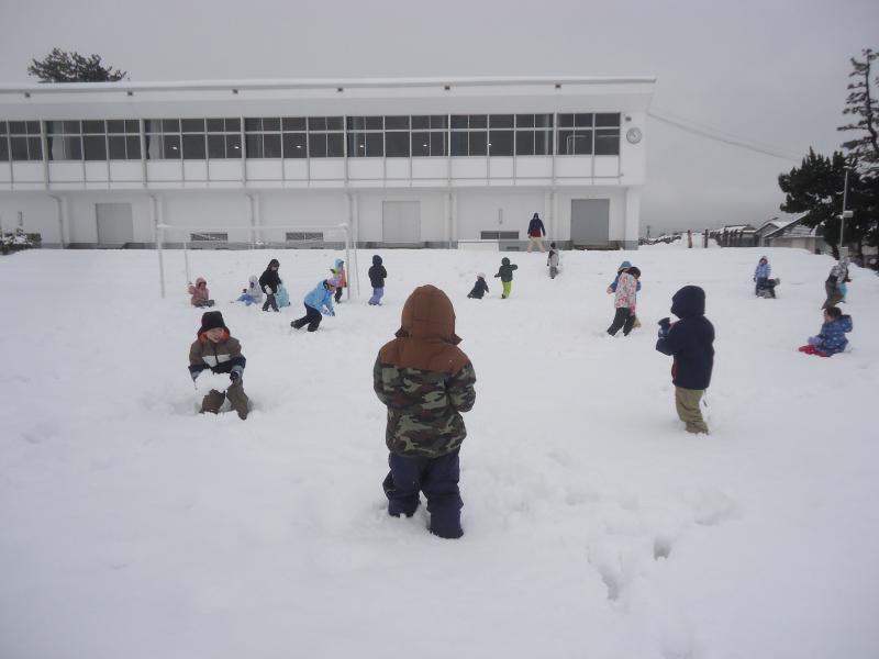 大きな雪だるまを作る子や雪合戦をする子、階段のところで雪の滑り台を楽しむ子など、みんなで思い思いの雪遊びを楽しみました。
