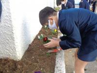 1学期に植えたサルビアは、枯れた花が多くなってきたため、園芸委員会が、春に向けて苗を植え替えてくれました。まずは、今まで学校を飾ってくれていたサルビアを丁寧に抜きます。雑草もきれいに抜いて、元肥を少し混ぜて土をふかふかにします。その後、春咲きのパンジーの苗を1つ1つ丁寧に植えてくれました。パンジーは雪の下に埋もれても、春にはきれいな花を咲かせるそうです。パンジーの花が成長できるように、早く温かくなるといいですね。園芸委員の皆さん、寒い中での作業でしたが、学校のために頑張ってくれてありがとうございます。