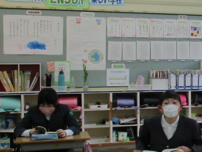 | 朝から笑顔があったり、本に夢中だったり、いい雰囲気で一日がスタートしていて、うれしいです。6年生を送る会が終わり祝日明けでした。あの時の感動を思いながら、見ていました。6年生は、あと3週間だね。 | |