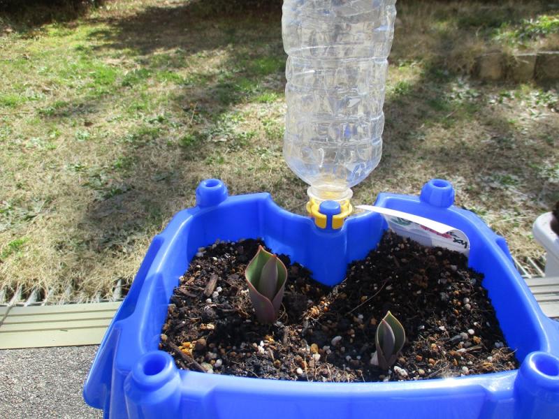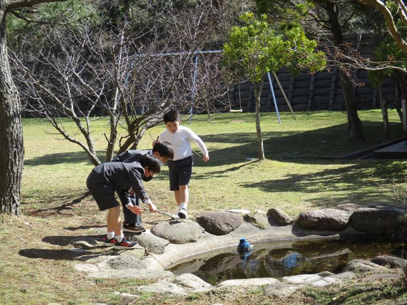 真っ青な空と日差しで、外がとても気持ちいい日でした。もう春です。 1年生のチューリップの芽が出ています。 のどかな昼休みの様子です。 |