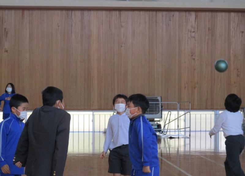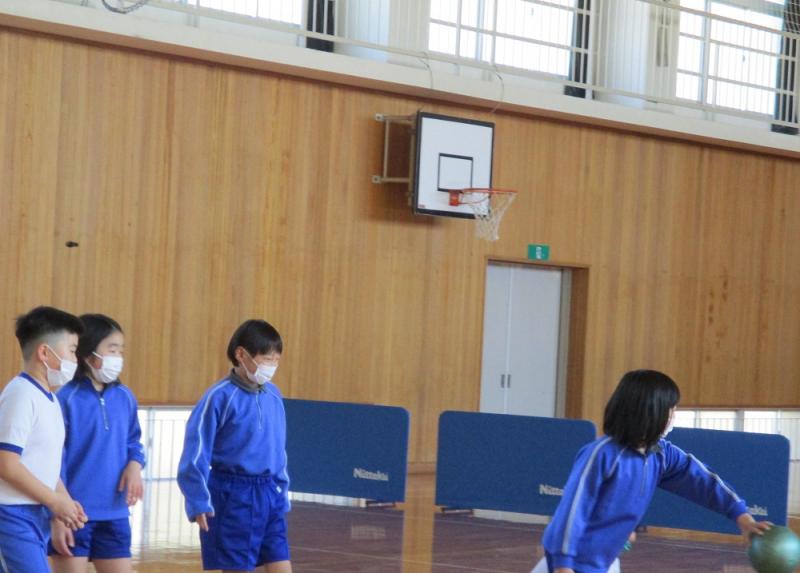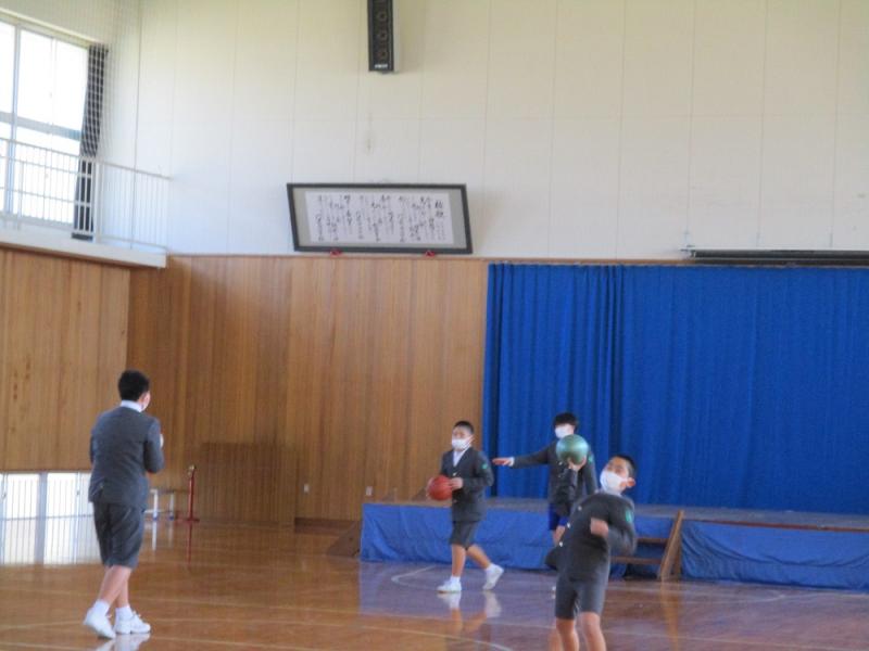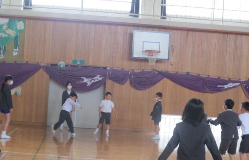 | 1・2年生の体育、玉入用の赤白玉を使っての投げ合いっこです。熱烈でした。 | |