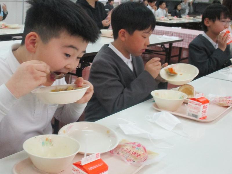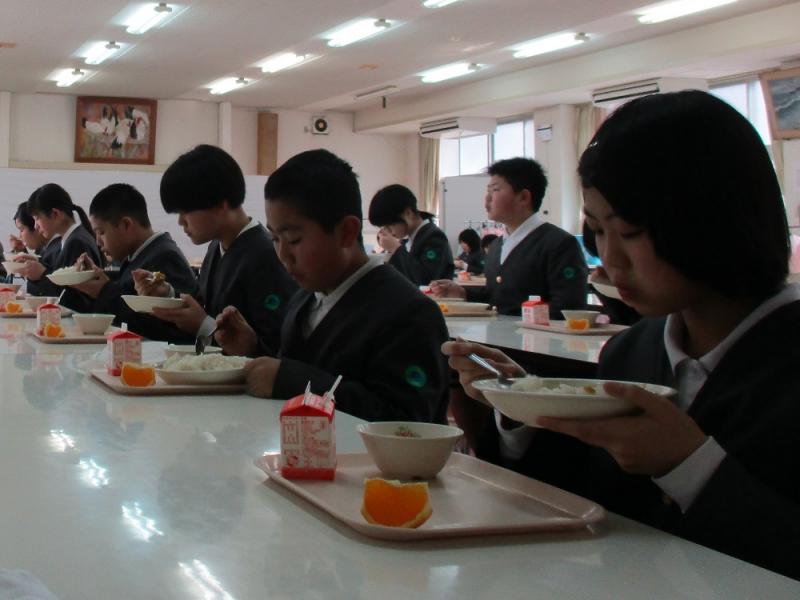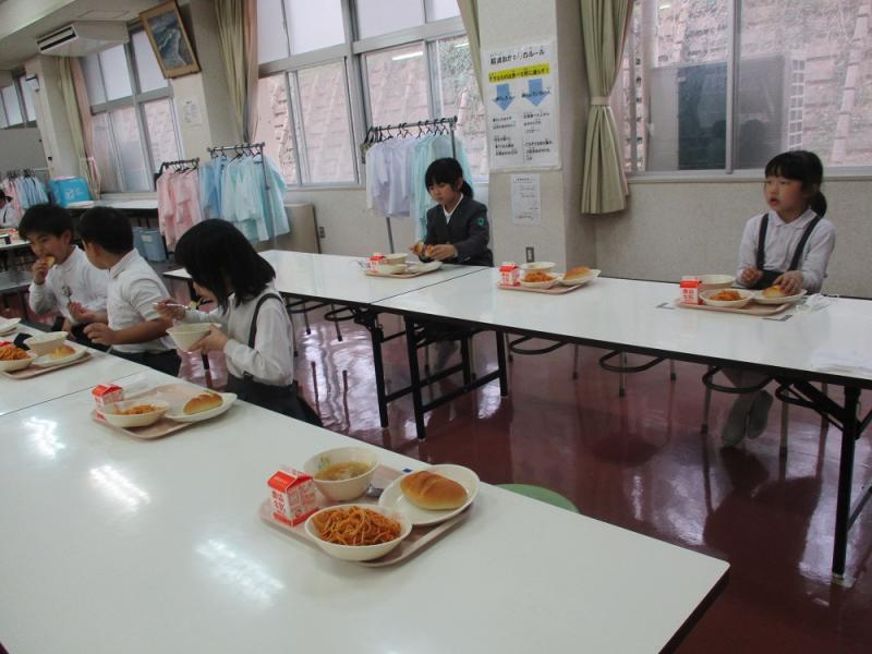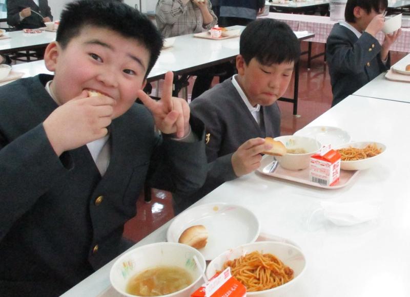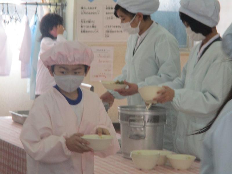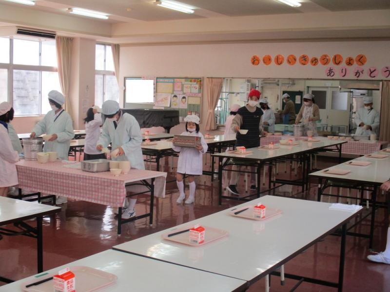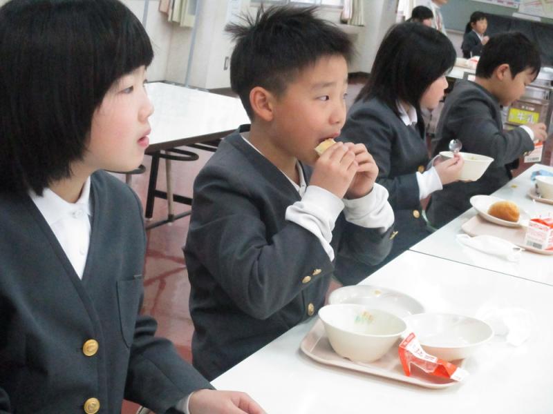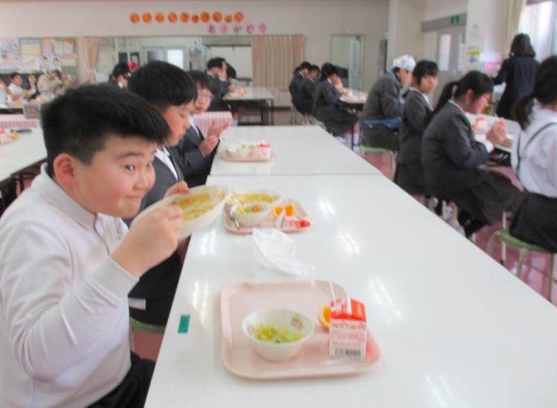 このように、1年間、給食を食べてきました。以前、修学旅行の宿泊先で、「食べ方がきれいですね」と高学年を褒めてくれました。低・中学年もこの高学年の姿を見ているので、きれいに食べています。6年生、いいお手本を、ありがとう。 また、共同調理場の皆様においいても、6年間、おいしい給食、ありがとうございました。 |