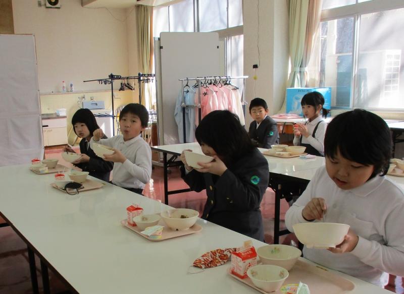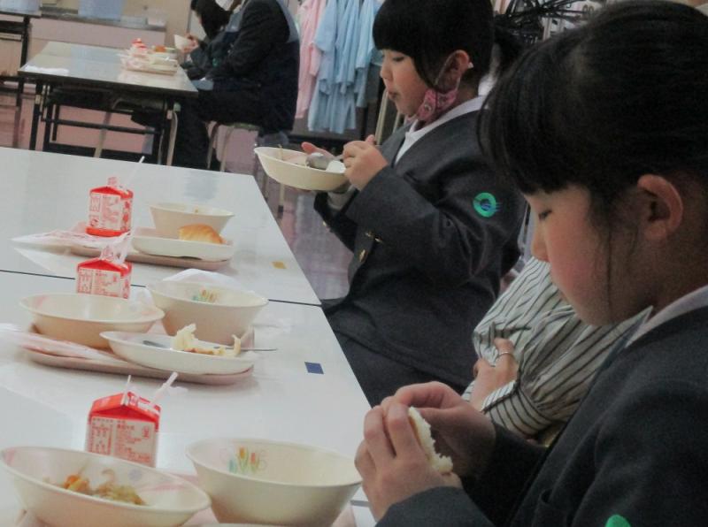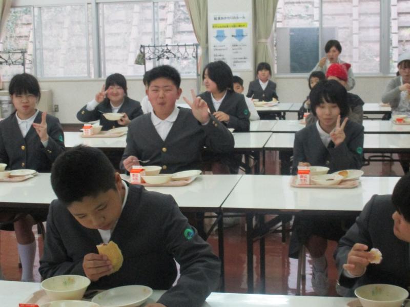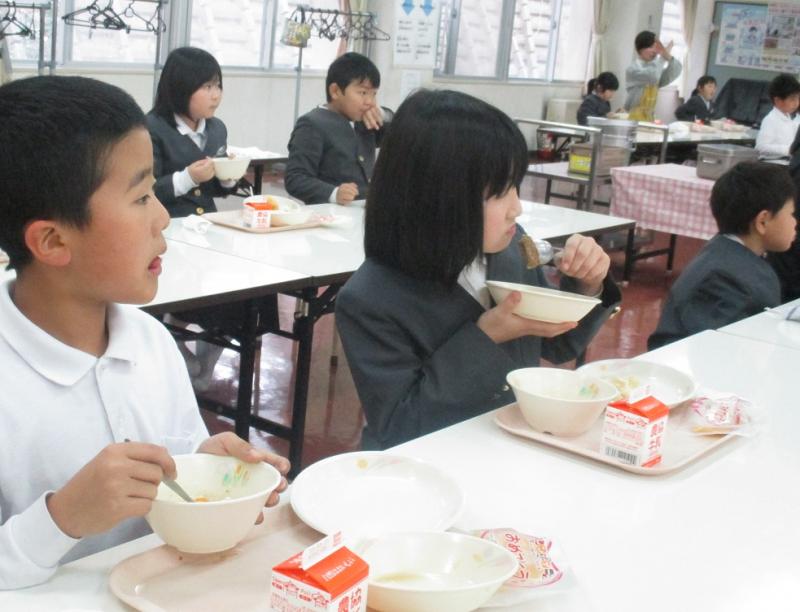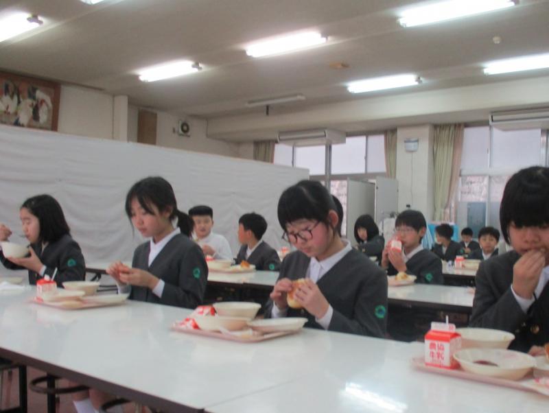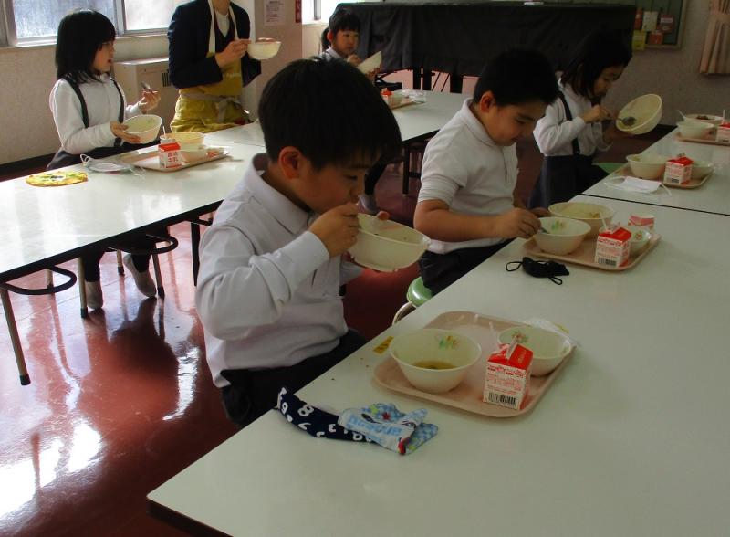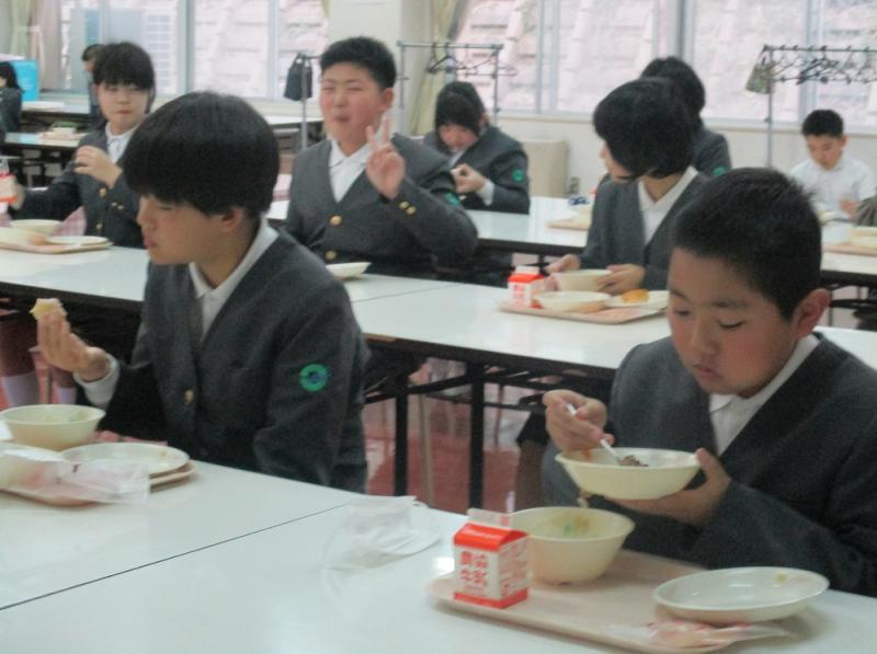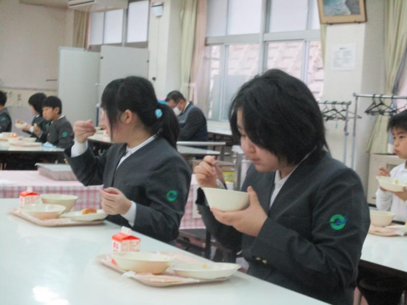 このように、1年間、給食を食べてきました。以前、修学旅行の宿泊先で、「食べ方がきれいですね」と高学年を褒めてくれました。低・中学年もこの高学年の姿を見ているので、きれいに食べています。6年生、いいお手本を、ありがとう。 また、共同調理場の皆様においいても、6年間、おいしい給食、ありがとうございました。 |