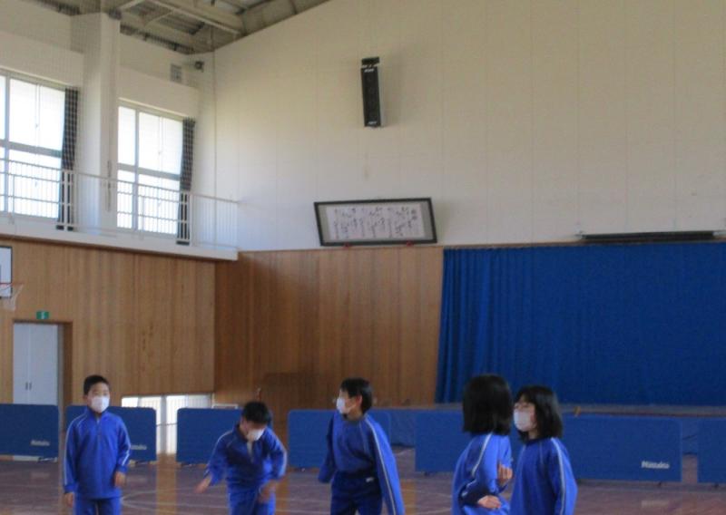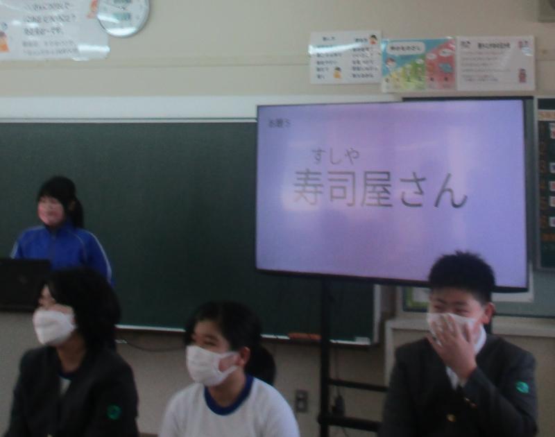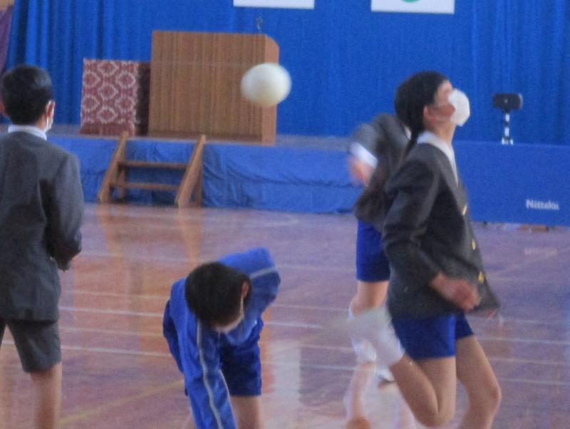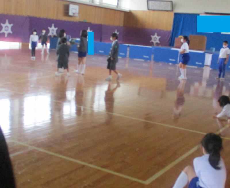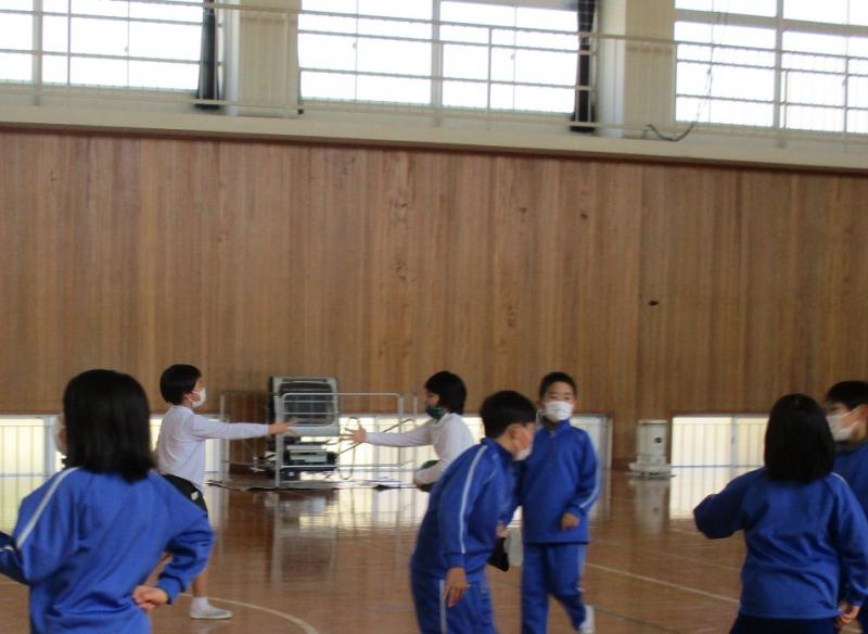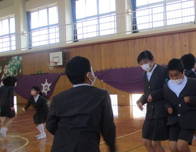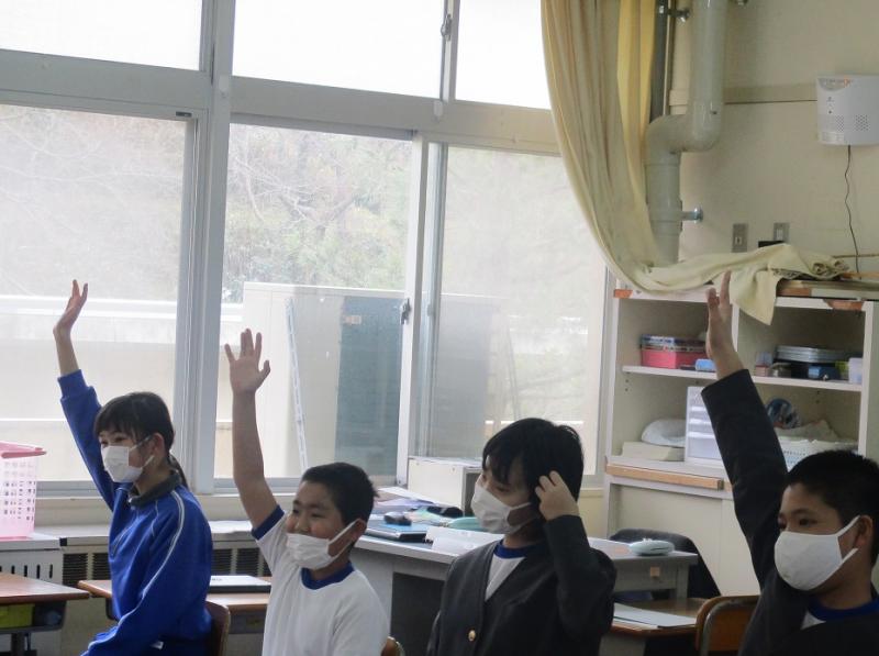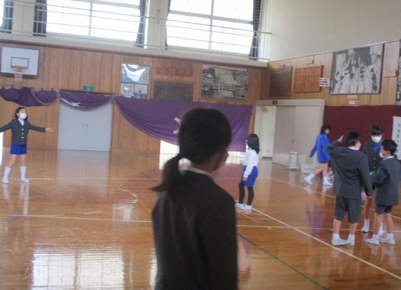 | 5限、5・6年生、最後のお楽しみ会。ジェスチャーゲームをしているところです。 | |