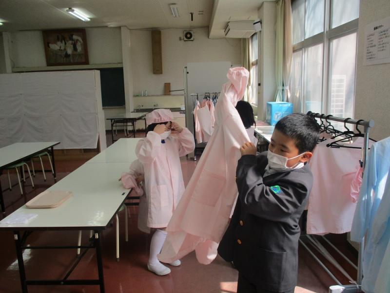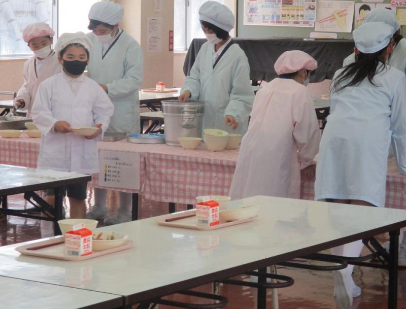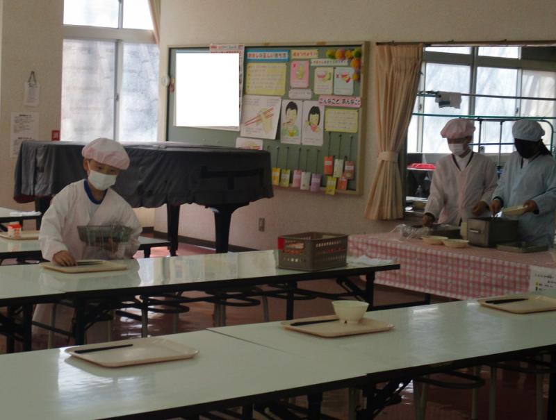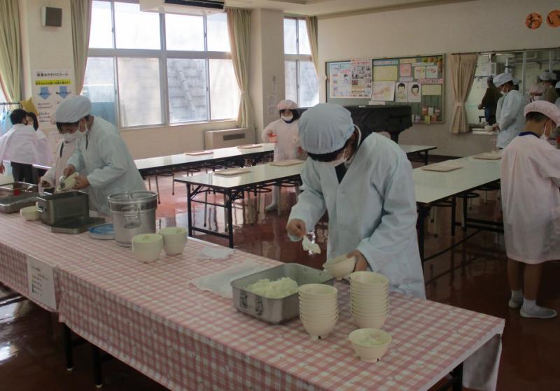 | 本校では、半数が給食当番で、週交代で行っています。その真面目な様子を載せました。 | |