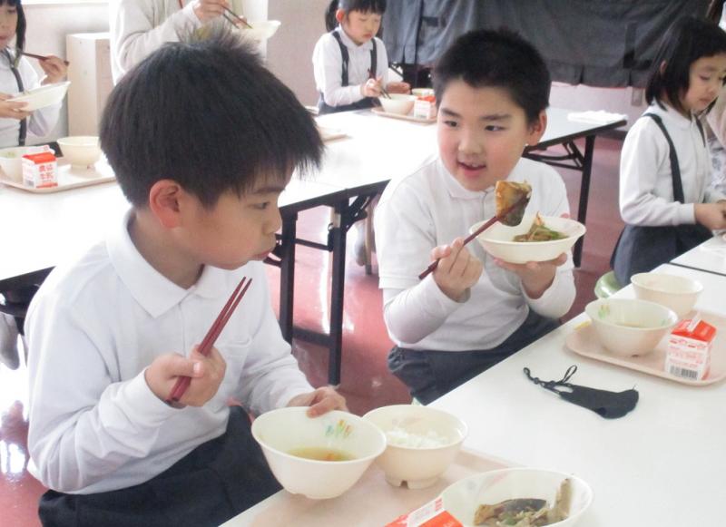 | 一年経てば、1年生も立派にお仕事をします。今日は、ちょっと甘いサバのみりんづけ焼でした。 | |