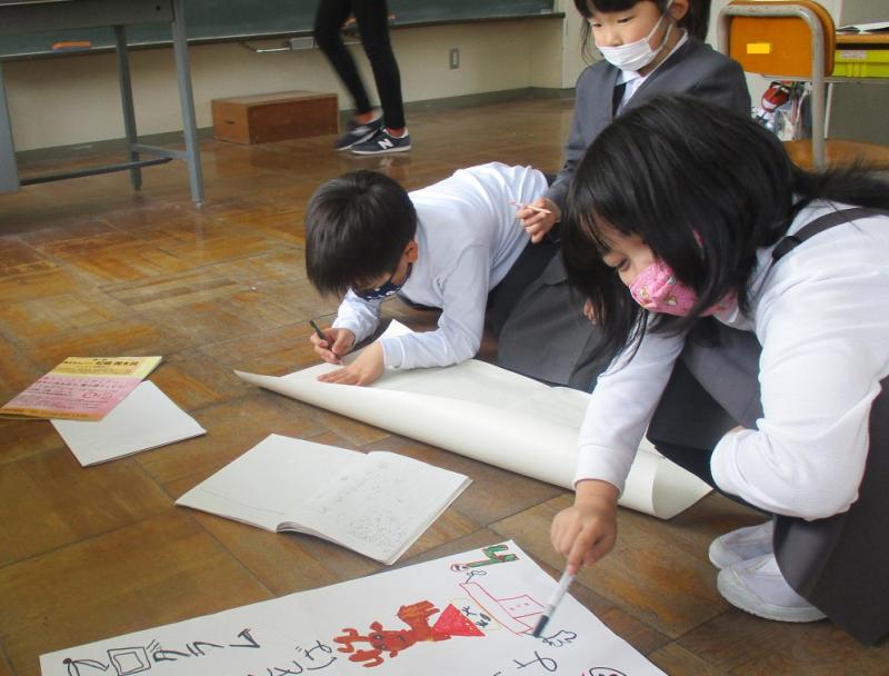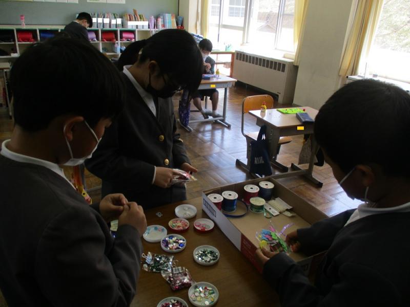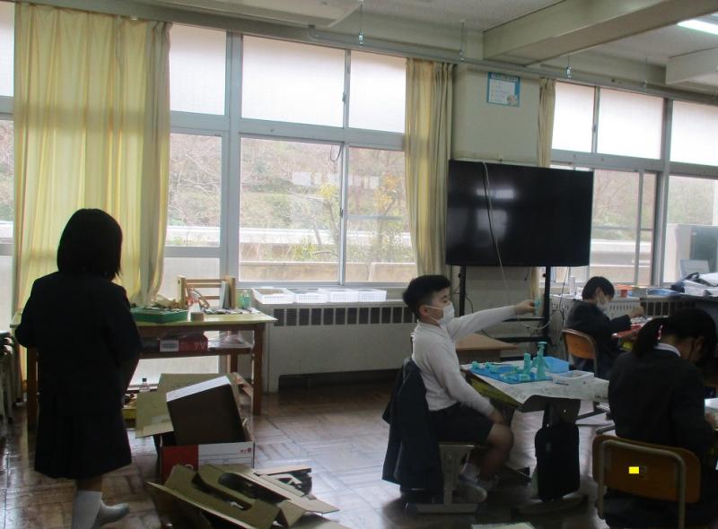 | 中学年、教室いっぱい使って、図工の作品を作っています。 | |