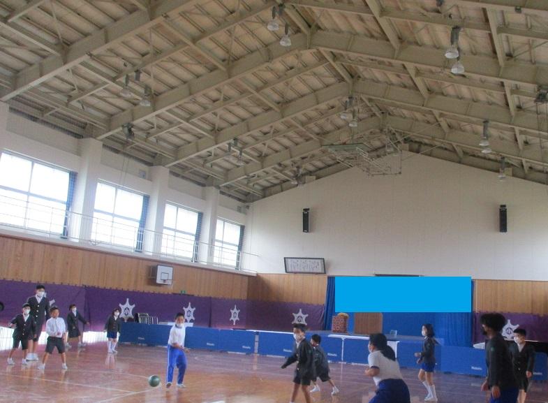 | 昼休み、6年生と最後のドッジボールということで、たくさんの人数で遊んでいました。活気ある体育館でした。 (図書委員会の人は仕事で、新刊の本を借りに行った人もいるので写っていません) |