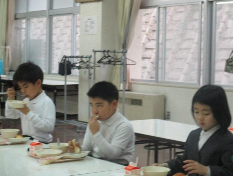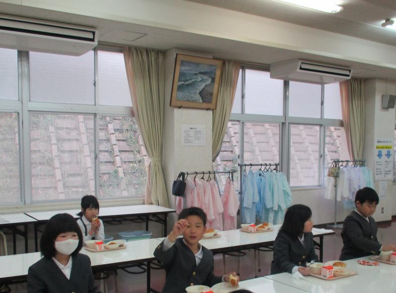 いい形で、今年度の鼓笛は終了できました。 さて、今日の給食のメニューは、おいしいチーズ入りパンとナポリタンでした。そこで、カメラを持って、私曰く、「パンに入っているのは、はい?」、児童の反応は「チーズ」。そう、「はいチーズ」シャッターを押してみました。 |