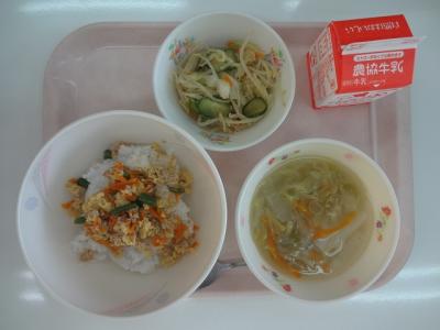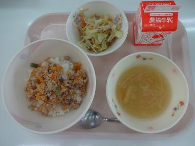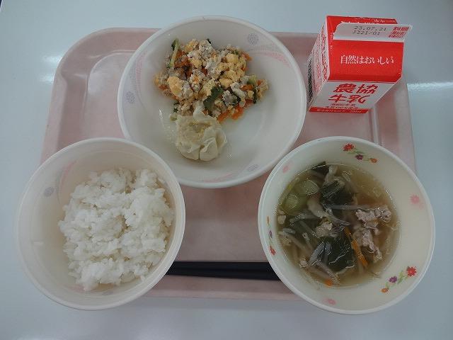 ~チキンライス、ひじきのサラダ、ワンタンスープ、牛乳、キャンディチーズ~