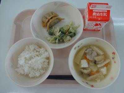 ~ごはん、揚げギョウザ、ブロッコリーのごまマヨ和え、豚汁、牛乳~
