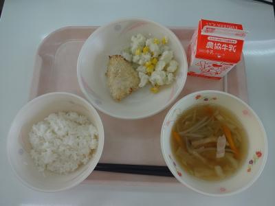 ~ごはん、鶏肉のマヨネーズ焼き、グリーンサラダ、コーンポタージュ、牛乳~