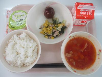 ~ごはん、ミートボール、ほうれん草の炒め物、ミネストローネ、牛乳、マスカットゼリー~