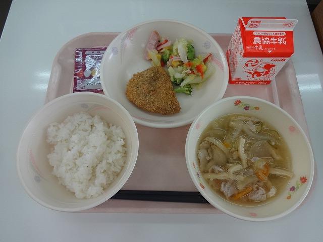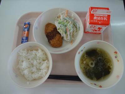 ~ごはん(減)、コロッケ、即席漬け、わかめうどん汁、牛乳~