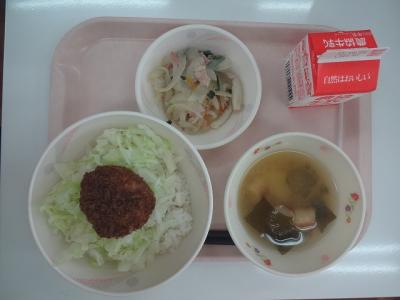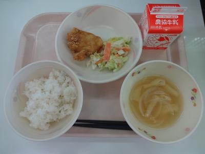 ~ごはん、鶏のから揚げ、コールスローサラダ、玉ねぎのみそ汁、牛乳~