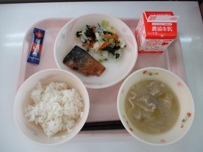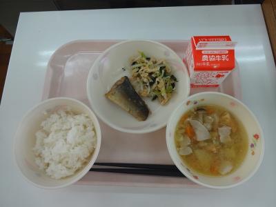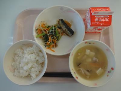~ごはん、さばのみりん焼き、小松菜のごま和え、めった汁、牛乳~
