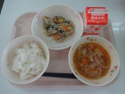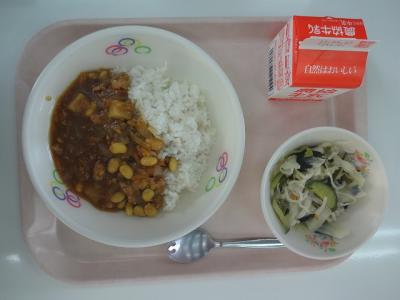 ~(麦飯)、大豆のひき肉カレー、ツナと柿のサラダ、牛乳~