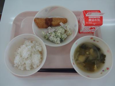 ~ごはん、とびうおフライ、チーズ入りポテトサラダ、わかめのみそ汁、牛乳~