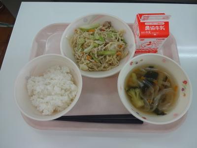 ~ごはん、厚揚げ入りホイコーロー、もやしのスープ、牛乳~