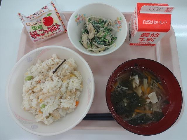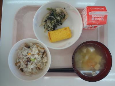 ~海女どりさざえご飯、卵焼き、小松菜のごま和え、めった汁、牛乳~
