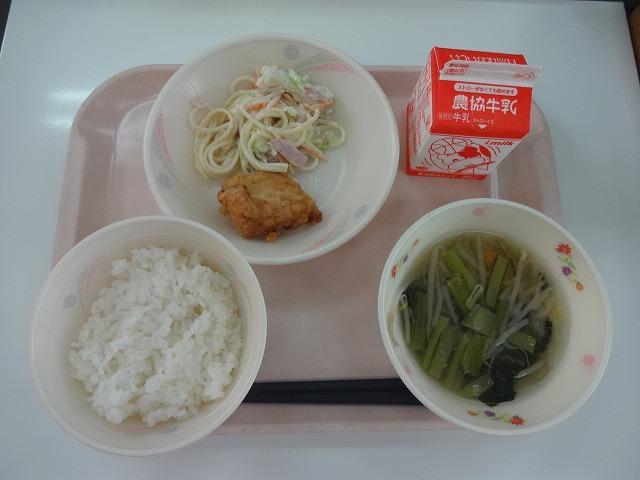 ~ごはん、鶏のからあげ、スパゲッティサラダ、みそ汁、牛乳~