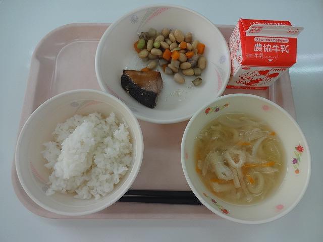 ~ごはん、ぶりの照り焼き、五目煮豆、具たくさんみそ汁、牛乳~