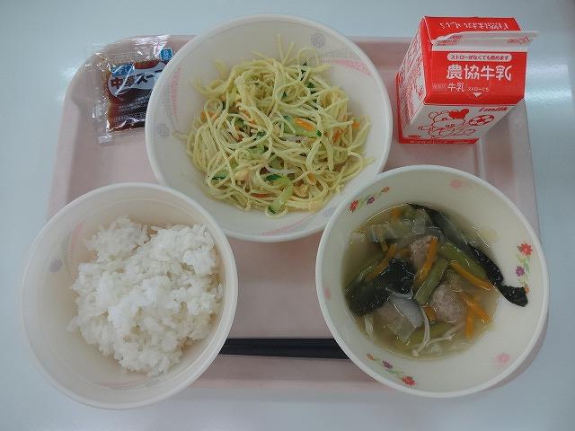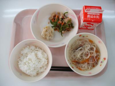 ~ごはん、コーンシュウマイ、ピーマンの炒め物、にゅうめん、牛乳~
