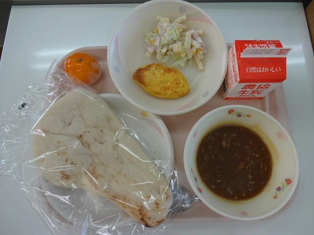 ~ナン、ドライカレー、オムレツ、マカロニサラダ、冷凍ミカン、牛乳~