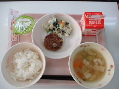 ~ごはん、ハンバーグ、マカロニサラダ、大根のスープ、牛乳~