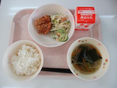 ~ごはん、鶏のから揚げ、切り干し大根のハムサラダ、じゃがいものみそ汁、牛乳~