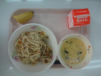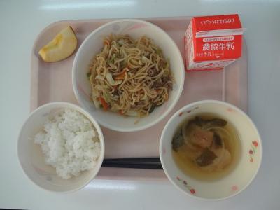 ~ごはん(減)、焼きそば、麩とわかめのスープ、牛乳、りんご~