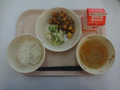 ~ごはん、厚揚げとキャベツのみそ炒め、みそ汁、牛乳、みかんゼリー~
