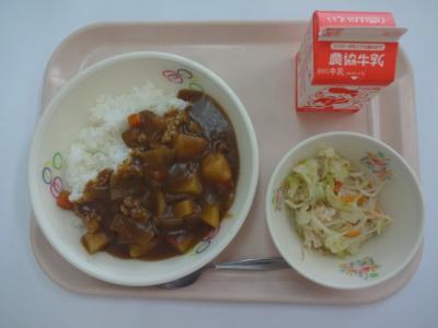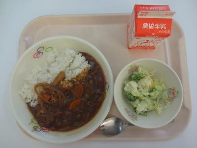~(麦飯)、大豆のひき肉カレー、ツナと柿のサラダ、牛乳~