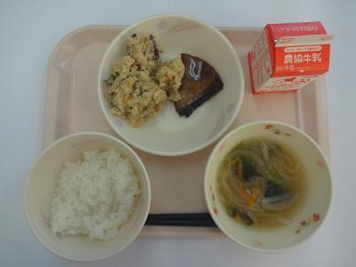~ごはん、ちくわの磯辺揚げ、じゃがいもの豚ひき炒め、みそ汁、牛乳~