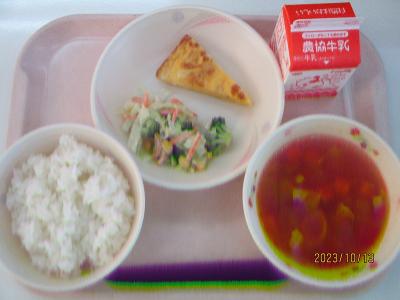 ~ごはん、スペイン風オムレツ、ブロッコリーサラダ、ミネストローネ、牛乳~