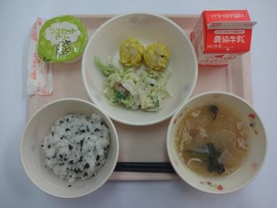 ~わかめごはん、かぼちゃシュウマイ、ツナサラダ、みそ汁、牛乳、マスカットゼリー~