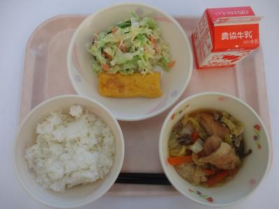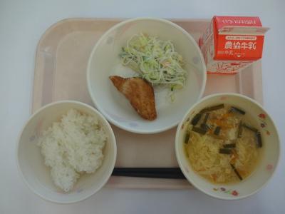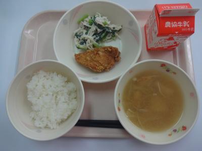 ~ごはん、鶏のから揚げ、切り干し大根のハムサラダ、じゃがいものみそ汁、牛乳~
