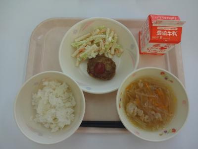 ~ごはん、ハンバーグ、マカロニサラダ、大根のスープ、牛乳~
