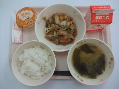 ~ごはん、厚揚げとキャベツのみそ炒め、みそ汁、牛乳、みかんゼリー~