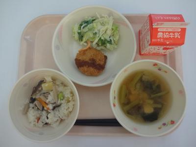 ~秋の五目ごはん、チキンカツ、グリーンサラダ、なめこのみそ汁、牛乳~