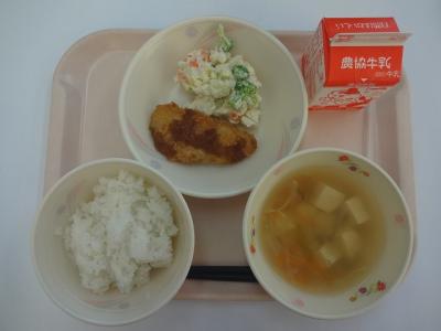 ~ごはん、メンチカツ、マセドアンサラダ、みそ汁、牛乳~