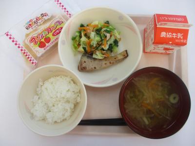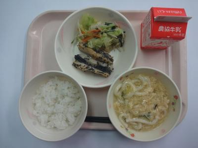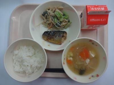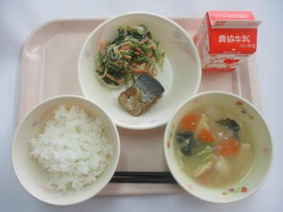 ~ごはん、さばのみりん焼き、小松菜のごま和え、めった汁、牛乳~