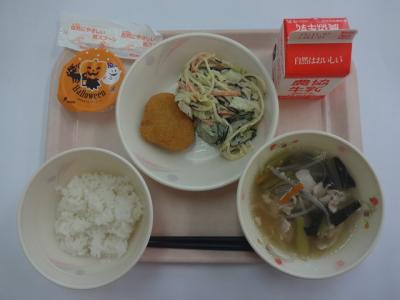 ~ごはん、焼き栗コロッケ、ひじきのサラダスパゲッティ、野菜スープ、牛乳、ハロウィンデザート~