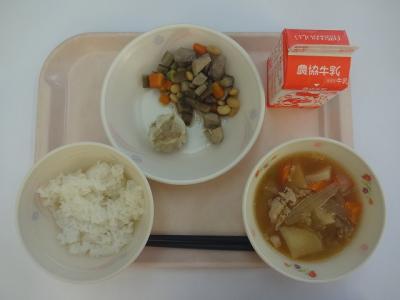 ~ごはん、シュウマイ、五目煮豆、じゃがいものうま煮、牛乳~