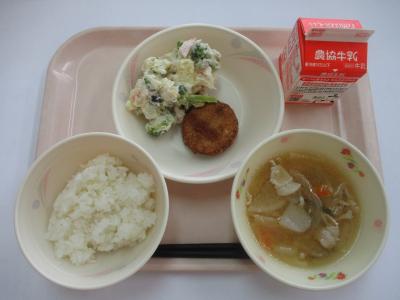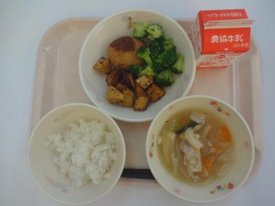 ~ごはん、メンチカツ、大学いも、ゆで野菜、豚汁、牛乳~