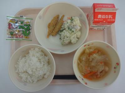 ~ごはん、きびなごカリカリフライ、大豆ポテトサラダ、野菜スープ、「豆によろこぶ」、牛乳~