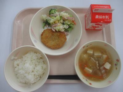 ~ごはん、豚肉コロッケ、花野菜サラダ、春雨スープ、牛乳~